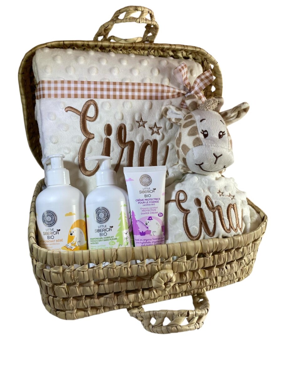 Canastilla en maletín de palmito natural completa y práctica, perfecta para regalar en nacimientos, baby showers o como detalle especial para recién nacidos. Una selección de productos útiles y delicados para los primeros cuidados del bebé, con acabados de alta calidad y diseño encantador.