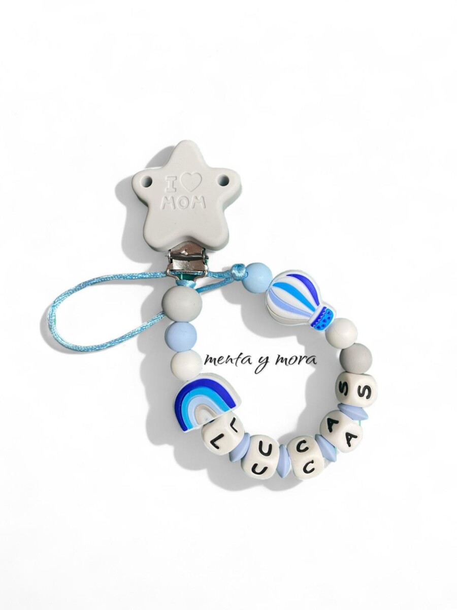 Chupetero personalizado con el nombre del bebé, no puede faltar en el equipamiento de guardería.