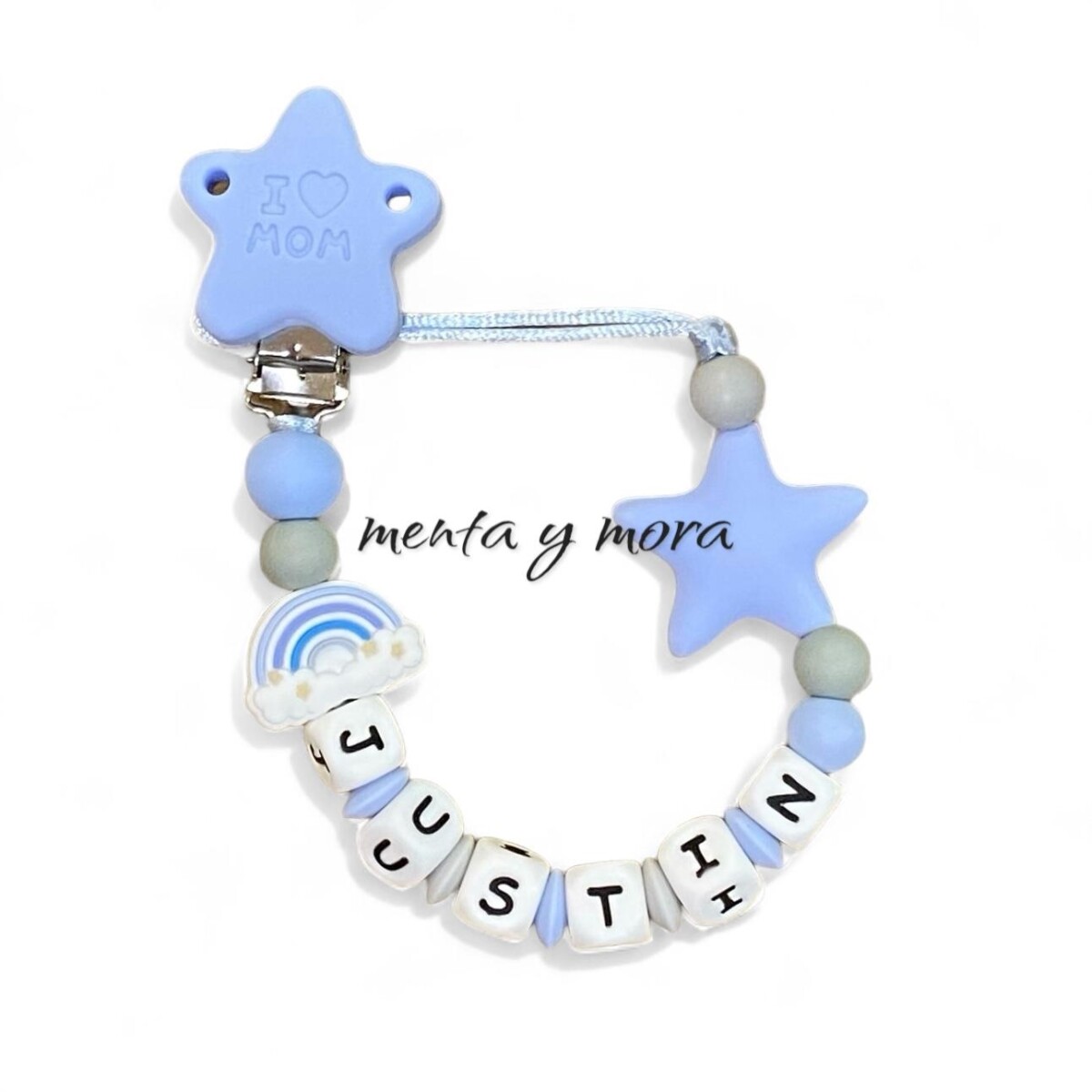 Chupetero personalizado con el nombre del bebé, no puede faltar en el equipamiento de guardería.