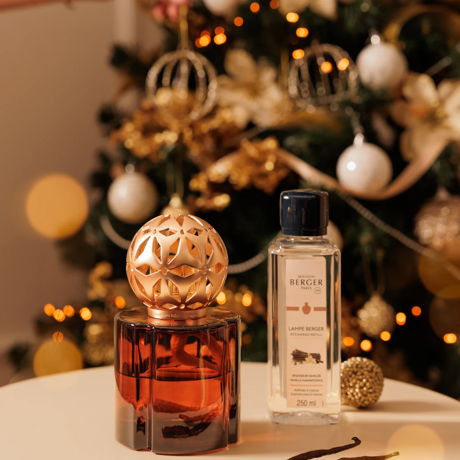 El cofre incorpora una recarga de 250 ml de la fragancia Vanille Splendeur, una composición rica y sensual que combina el dulzor refinado de la vainilla con matices cálidos que envuelven el hogar en una atmósfera acogedora. Su carácter cálido y elegante aporta serenidad y bienestar, convirtiendo cada rincón en un espacio lleno de confort.