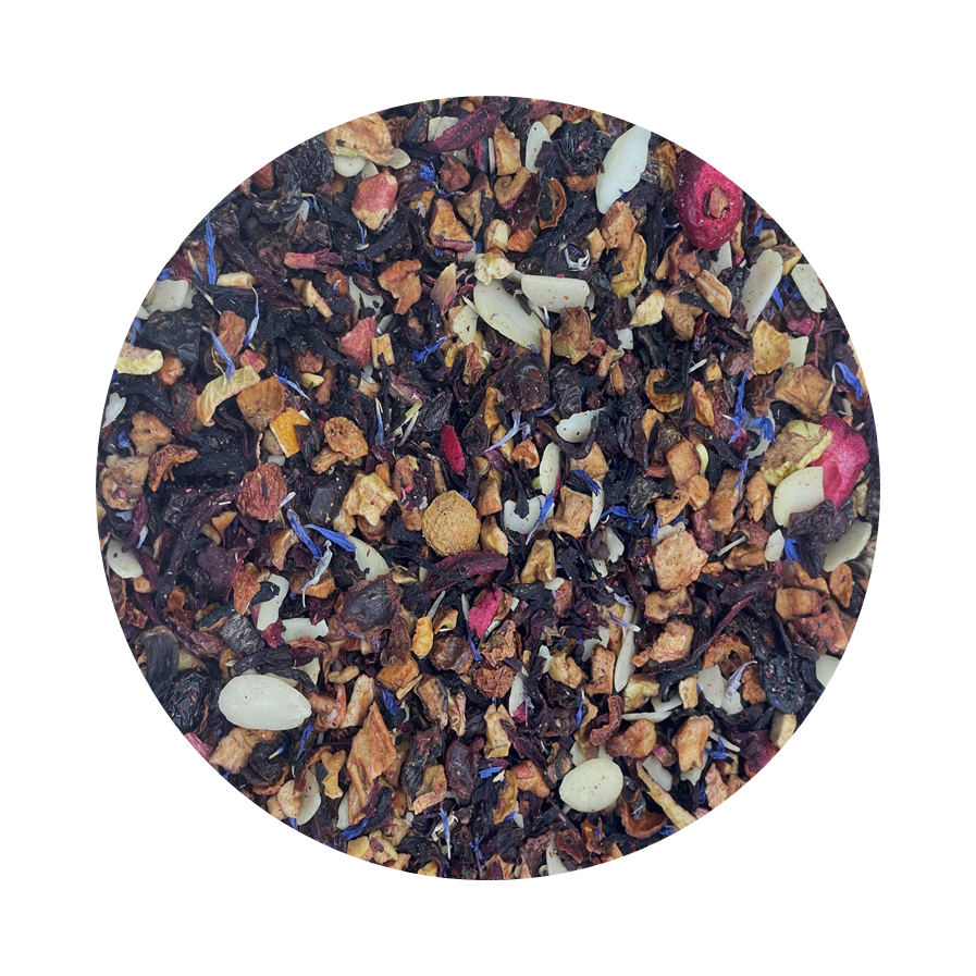 La Mezcla de Frutas Amaretto con Almendras ofrece una infusión con carácter, elaborada a partir de manzana, escaramujo, hibisco, grosella y arándanos, enriquecida con almendras y delicados aromas de almendra y vainilla. El resultado es una bebida afrutada y envolvente, con un perfil aromático cálido y bien equilibrado.