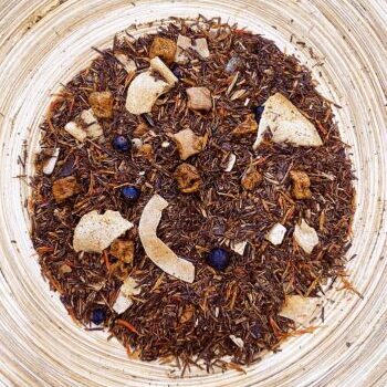 Rooibos, chips de coco tostado, chips de chocolate, canela, manzana, bayas de enebro, cártamo y aromas. Tentadoras notas de manzana, canela y chocolate para horas reconfortantes en los días fríos. Dulce, profundo.